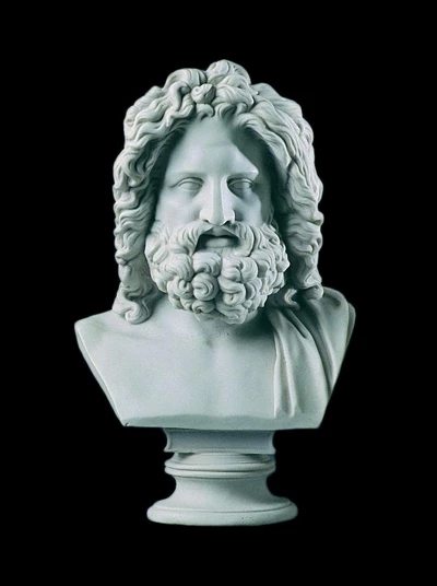 This is an impressive hand carved bust of the Greek god Zeus whose hair is decorated with laurel leaves. An amazingly real portrait of this bearded figure dressed in a lavish robe and made from pure white marble. A perfect piece for a library or study.