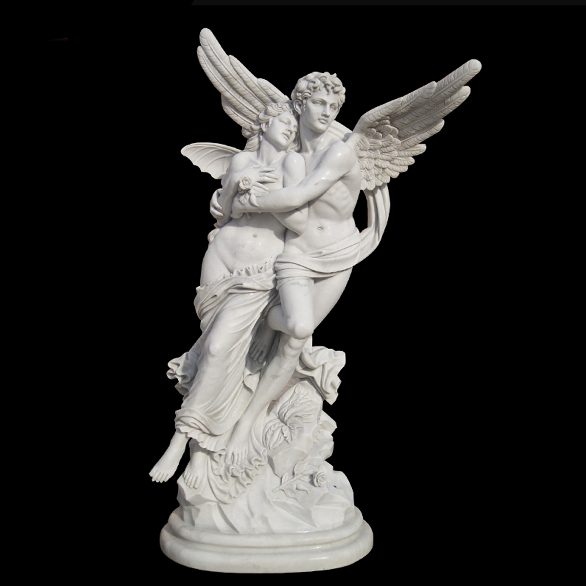 This white marble statue of Psyche and Eros hand-carved by our top notched sculptor! White marble’s smooth texture makes it a realistic masterpiece! From this beautiful mable statue, we could see Psyche’s face has an expression of contentment and happiness. Eros’s face shows his devotion to protect their love! Other details like the open wings on their back and draping clothings makes the natural stone garden sculpture looks like they are about to fly to sky.