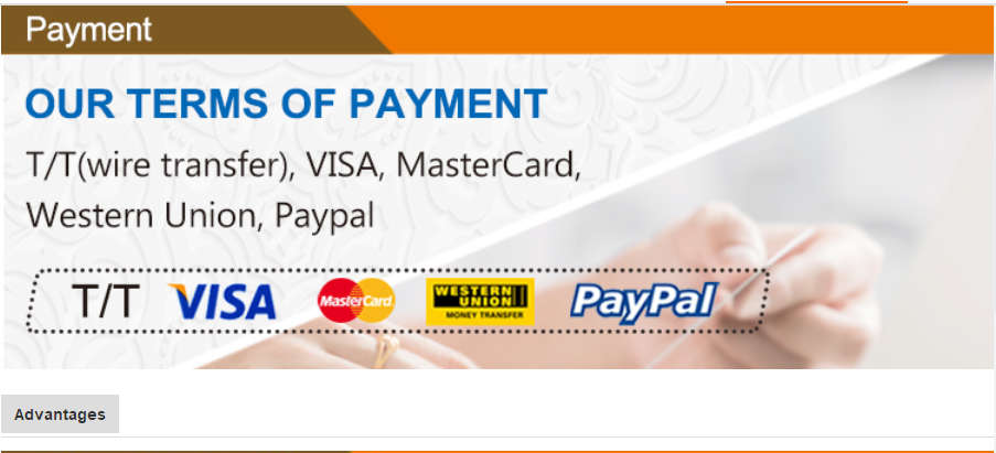 | Payment terms | T/T, Trade Assurance, Paypal, Western Union, MoneyGram etc. |